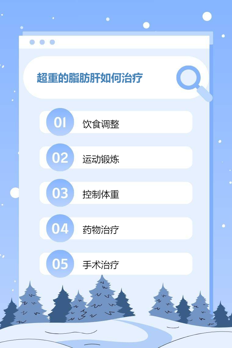 超重的脂肪肝可通過飲食調(diào)整、運(yùn)動鍛煉、控制體重、藥物治療、手術(shù)治療等方法進(jìn)行治療。